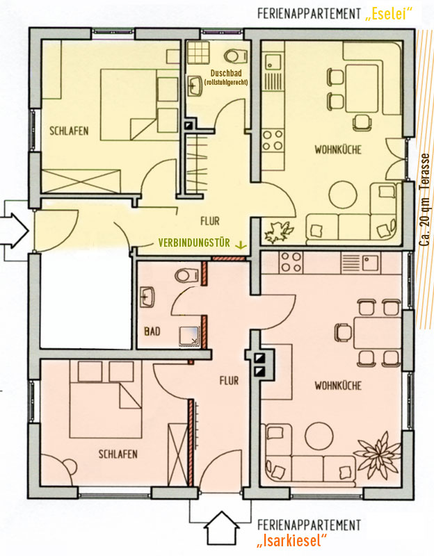Isarkiesel Ebenerdig im Erdgeschoss • Ca. 35 qm Wohnraum für bis zu 3 Personen